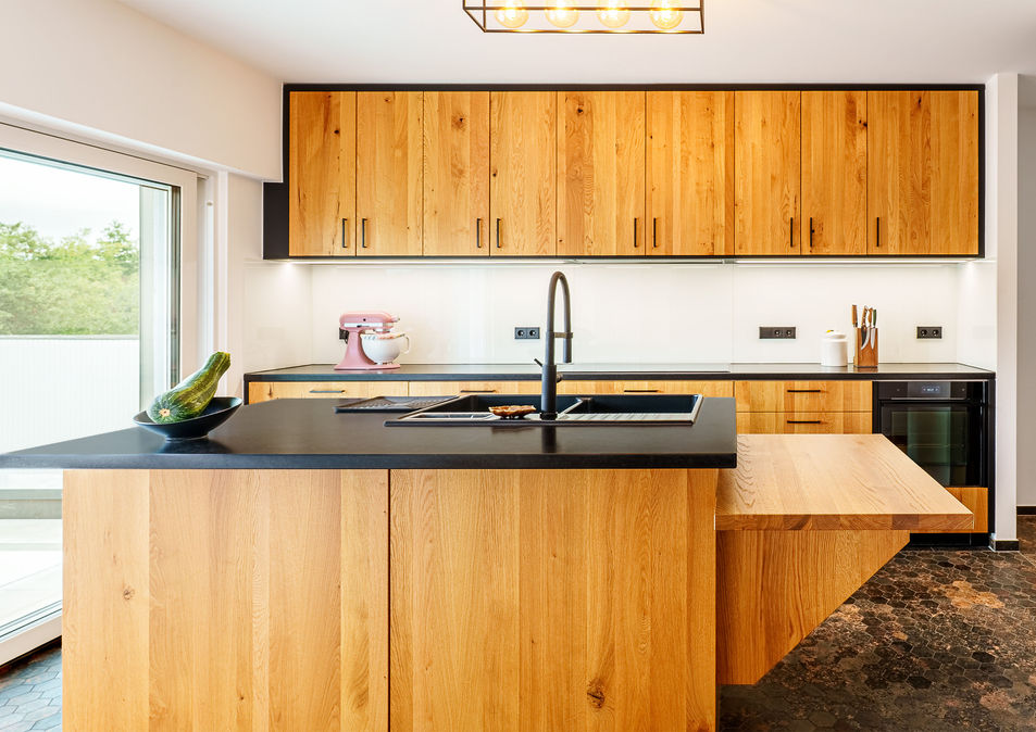 Sou sot eis den Här aus dem Haus:„Schéi waarm am Holz an all Akzent schwaarz, wou et nëmme geet.“„ Ganz gäre“ soe mir. Gestaltung, Hierstellung a Montage duerch eis. Nieft de Miwwel och d’Aarbechtsplacken am Eeche massiv a schwaarze Granit zudeem d’Geräter an de Spritzschutz aus Glas. Highlight an dëser Kichen: zwou verschidden héisch Aarbechtsplacken, fir déi grouss a manner grouss Persounen am Stot — och an der Kichen ass Ergonomie wichteg.