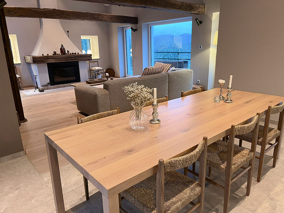 „Ech hätt gär en Dësch, esou wei een e mole géif, eng Plack a 4 Stempelen.“ Hei war et d’Erausfuerderung d’Faarf vum Dësch, passend bei d’Still ze kréien, wat sech en cours de route geännert huet an den Dësch elo perfekt bei de Buedem passt. Klassesch aus massivem Eechenholz, opgehellt/gewäisst. Mat 3 formschlëssege Gratläischten, fir dass d’Dëschplack sech net verzeie kann.